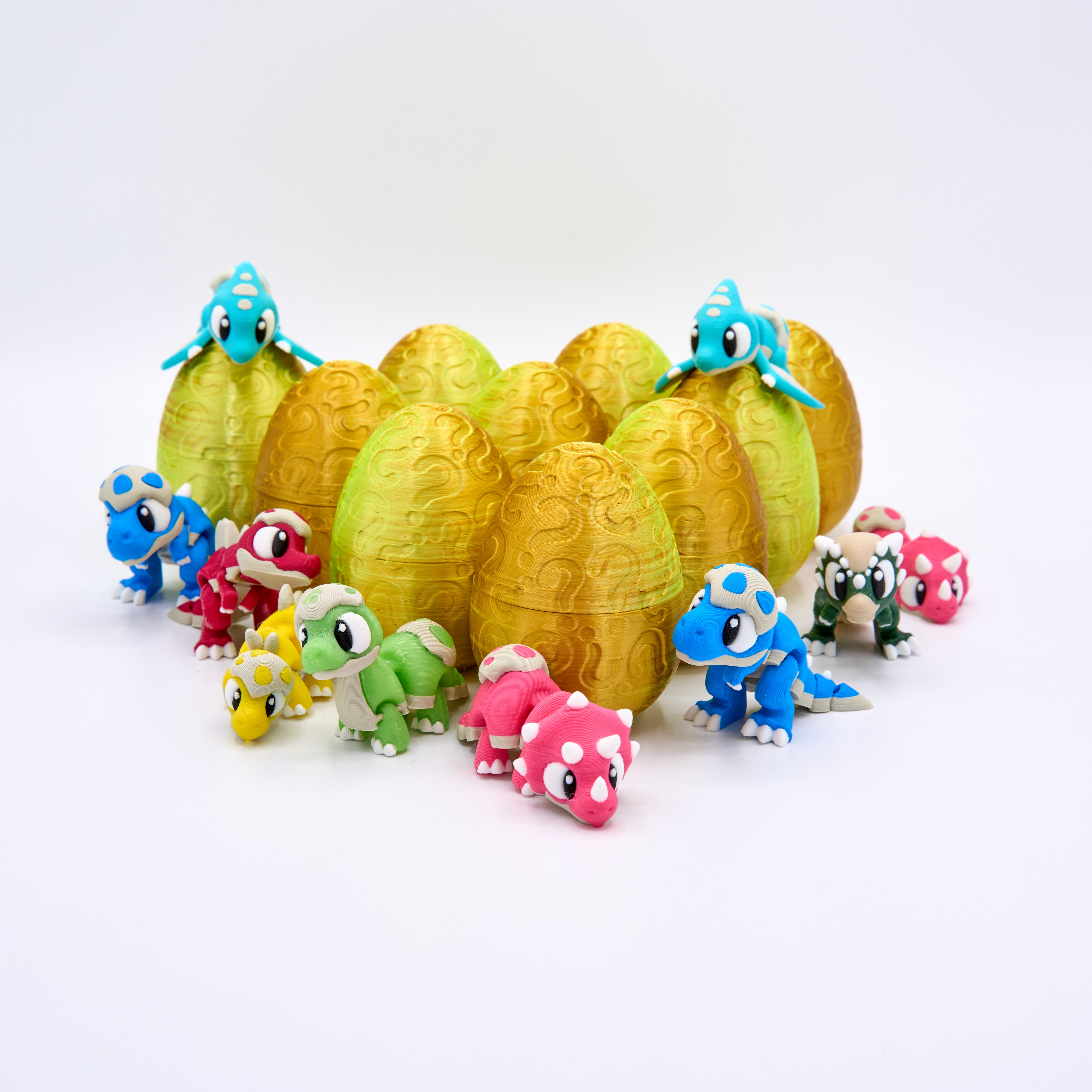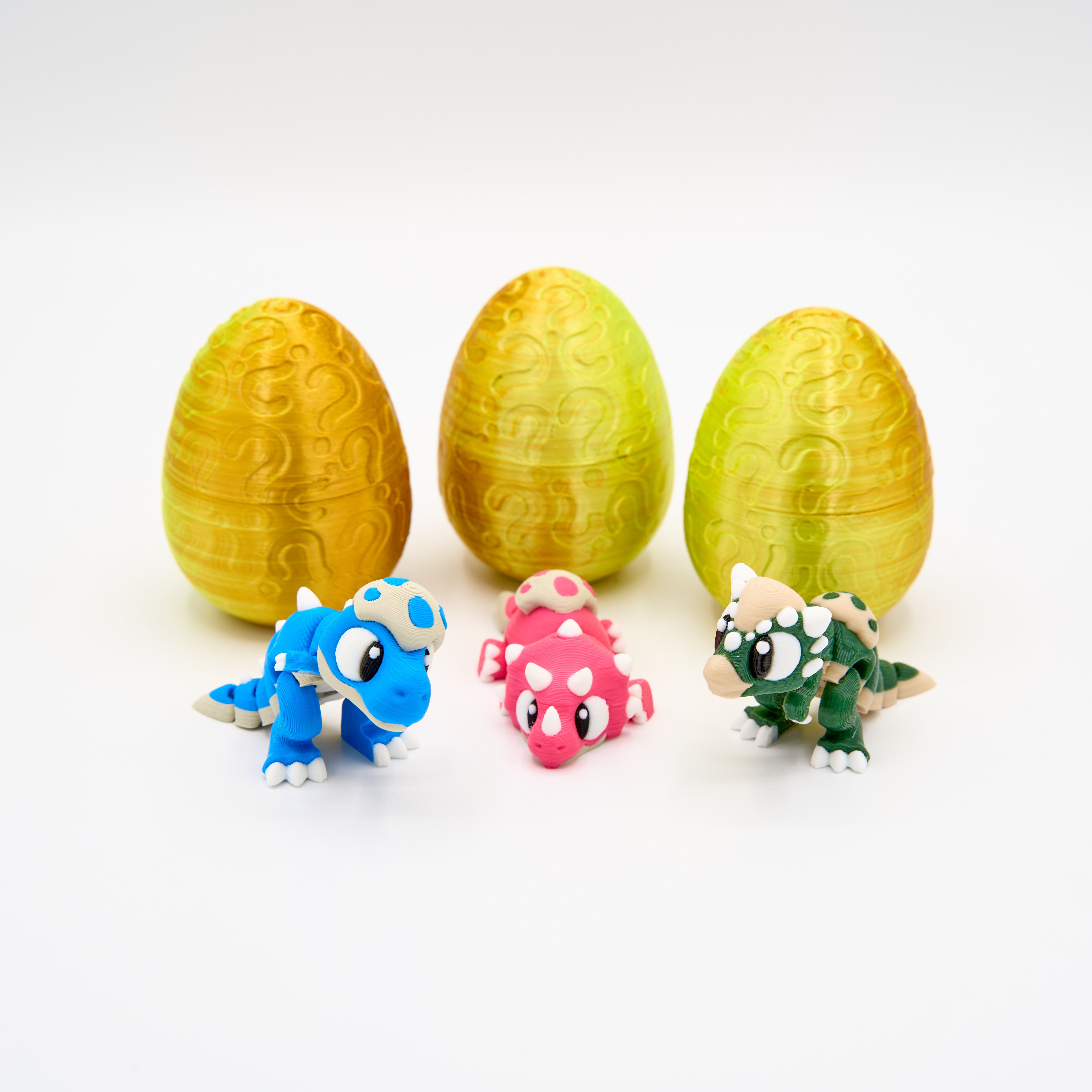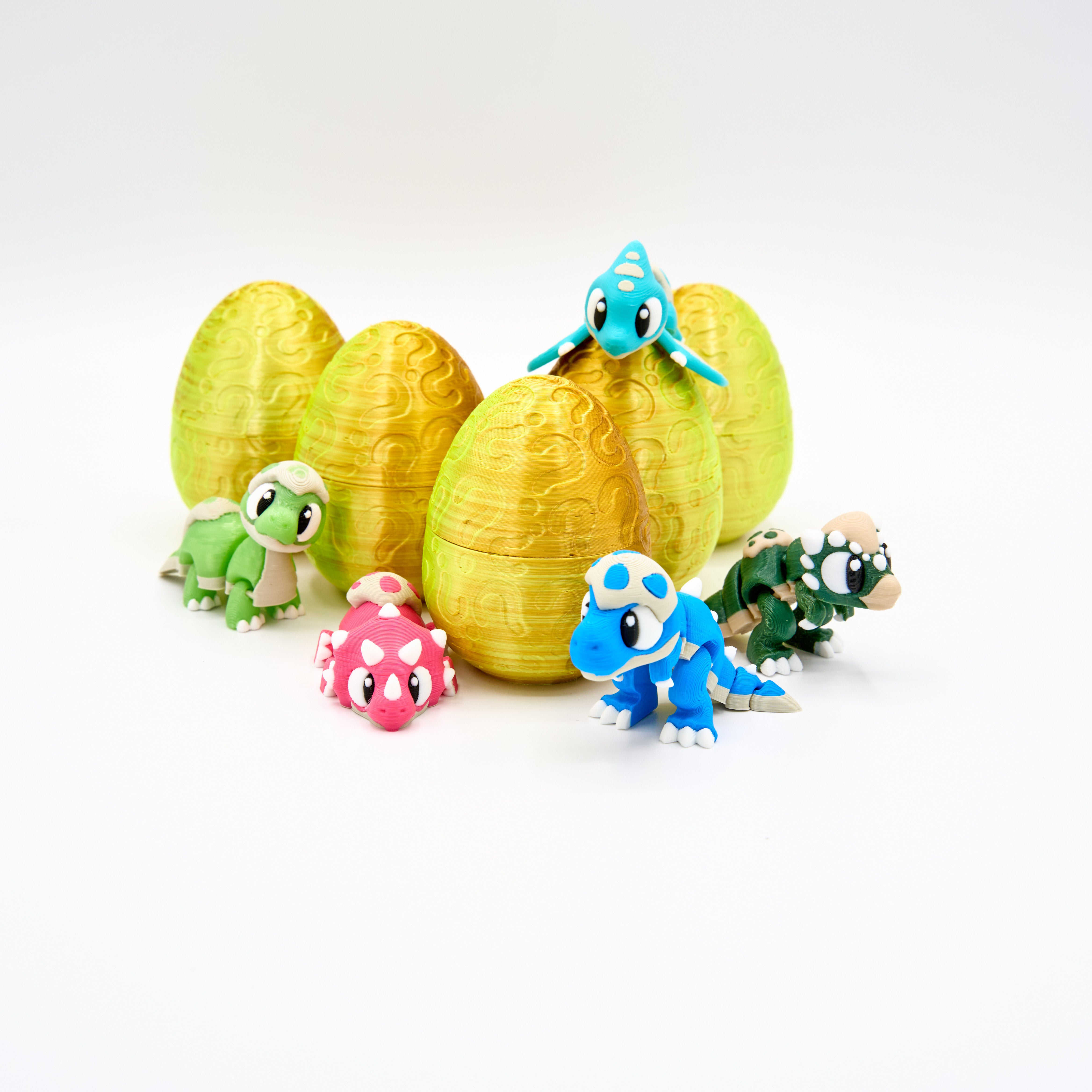 Alle Dinos bestehen aus 100% recyceltem PLA. Die Eier aus 100% PLA Silk.